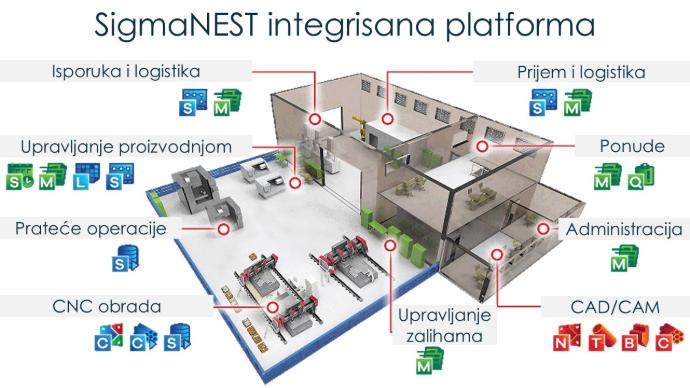 Sigma Suite predstavlja celovito rešitev, ki integrira CAD/CAM, izdelavo krojnih seznamov (nesting), načrtovanje (APS) in spremljanje proizvodnje (MES) ter poslovne sisteme (ERP, MRP, MES), kar omogoča optimizacijo proizvodnih procesov in učinkovito upravljanje vseh vidikov tovarne.