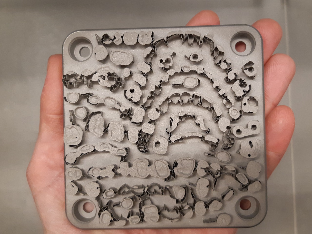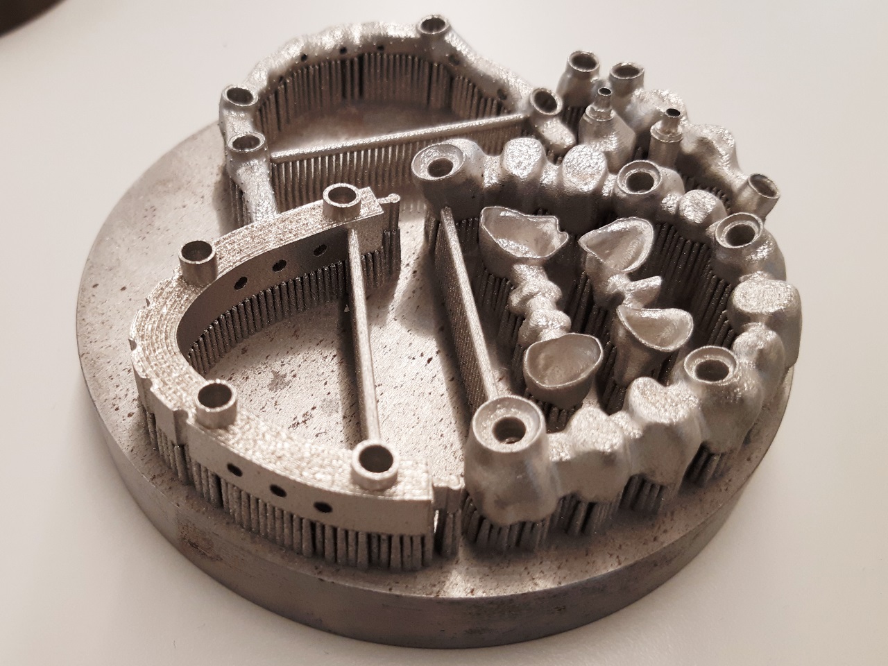 Kada su utvrdili sa kojim laserom (tj. 3D štampačem) žele da proizvode, odredili su period od nekoliko meseci da definišu optimum snage i brzine. U periodu od 3-6 meseci podešavali su brzinu štampe i jačinu lasera kako bi odredili u kojoj tački dobijaju odličan kvalitet i zadovoljavajuću efikasnost. Na slici je uporedo prikazan presek radne ploče (podrške) i delova kakvi izađu iz 3D printera.