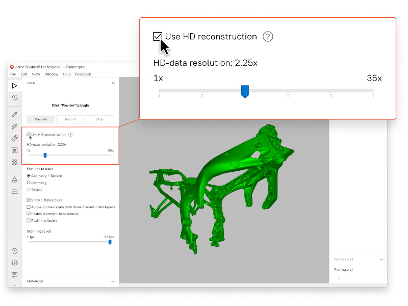 • praćenje procesa skeniranja komada uz podešavanja samog skeniranja u smislu broja frejmova u sekundi, potrebne količine detalja, željene brzine rada, itd.