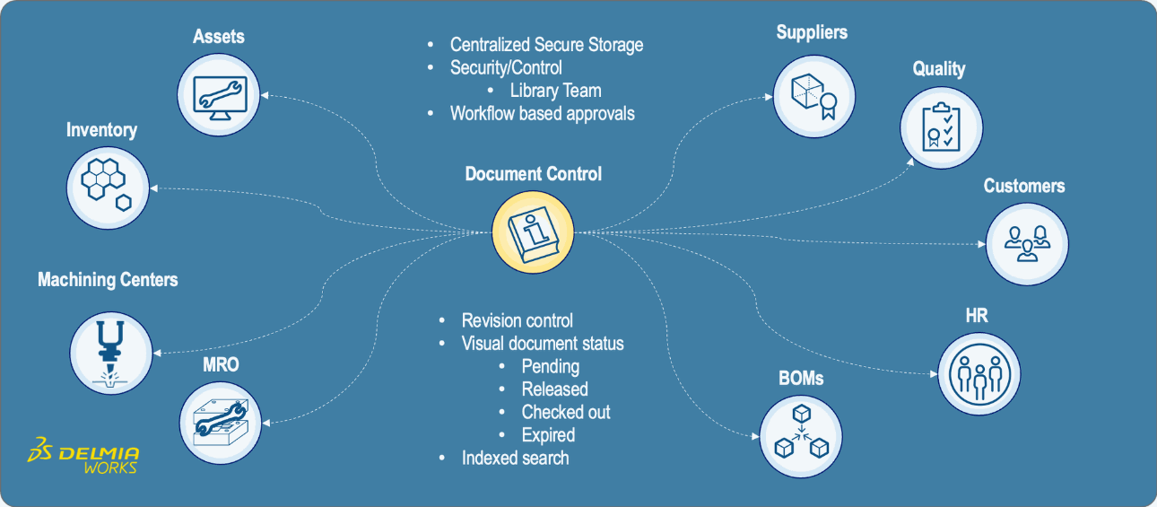 Document Control modul u DelmiaWorks‑u je centralno mesto za upravljanje svim dokumentima koji imaju veze sa artiklima, BOM‑ovima, radnim nalozima, kvalitetom, kupcima, dobavljačima i projektima, uz punu kontrolu verzija, pristupa, važenja i povezivanja sa procesima u ERP/MES sistemu. Umesto da radne instrukcije, crteži, Excel tabele, procedure i zapisnici „žive“ u folderima na serveru ili u mailovima, Document Control uvodi koncept dokumentnih biblioteka sa statusima i pravilima, a kroz Documents tab se ti dokumenti vezuju za konkretne zapise u svim ključnim modulima.