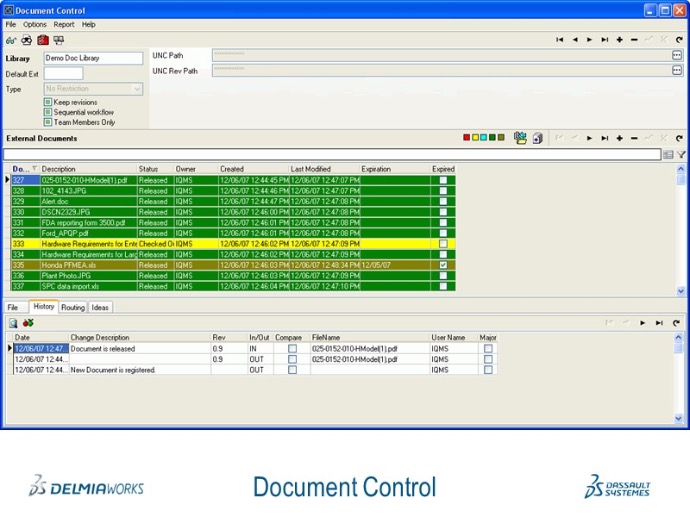 Skoro svaki važan modul u DelmiaWorks‑u (Inventory, BOM, Work Orders, Customers, Vendors, FMEA, Control Plan, Quality Projects, Gage/Calibration, itd.) ima posebnu karticu Documents sa pod‑tabovima Internal, External i Email Correspondence. Na tom mestu se za svaki konkretan zapis (npr. jedan artikal, jedan BOM, jedan FMEA) mogu povezati interni dokumenti (napravljeni u ugrađenom editoru), eksterni dokumenti (Word, Excel, PDF, slike, video) i email prepiska, tako da korisnik iz ERP‑a ima jedan klik do svih relevantnih informacija. Kada su dokumenti povezani sa zapisom, na formi se vidi ikonica koja jasno signalizira da postoje prikačeni dokumenti, a korisnik iz iste forme može da ih otvori, odštampa ili pregleda prethodne verzije.