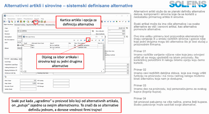 Alternate items omogućavaju da se u Item master i MRP logici definišu zamenski artikli koji mogu preuzeti ulogu osnovnog artikla u slučaju nestašice, promene dobavljača ili tehnološke zamene. U MRP-u se alternate items mogu koristiti kao deo Auto MRP logike – ako primarni artikal nema dovoljno raspoloživih zaliha ili je lead time predugačak, sistem može na osnovu pravila i prioriteta da predloži korišćenje alternata (uz odgovarajuće upozorenje), što planeru daje mogućnost da brzo reaguje bez ručnog pretraživanja. U kombinaciji sa alternativnim BOM-ovima, alternate items pružaju dodatni sloj fleksibilnosti: moguće je da jedan završni proizvod ima više varijanti strukture i više prihvatljivih materijala, a da MRP sve to uzima u obzir pri računanju potreba i generisanju predloga naloga i nabavki.