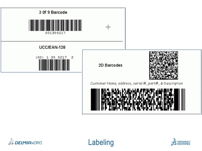 DelmiaWorks razlikuje više tipova nalepnica: manufactured (za gotove i polugotove proizvode), purchased (za kupljene artikle), pallet labels (pallet nalepnice), mixed labels (za mešovite palete i kompozitne pošiljke), non‑serial/reject nalepnice i specijalne VIN etikete za industrije sa posebnim zahtevima. Manufactured i purchased nalepnice se generišu iz različitih modula – RealTime Labels i Production Reporting za proizvedene artikle, Receiving i Inventory Labels za kupljene artikle – ali sve završavaju u istoj MasterLabel strukturi. Pallet nalepnice se kreiraju u Pallet Builder modulu ili kroz napredne WMS transakcije i povezuju više „box“ nalepnica u jedan parent serial, dok mixed labels predstavljaju „kišobran“ nalepnice za kombinaciju različitih artikala, lotova ili revizija na jednom nosaču. VIN nalepnice dopunjuju MasterLabel dodatnim poljima (VIN, konfiguracioni kod, masa, dimenzije vozila i dr.) i koriste se posebno u automobilskoj i srodnim industrijama.