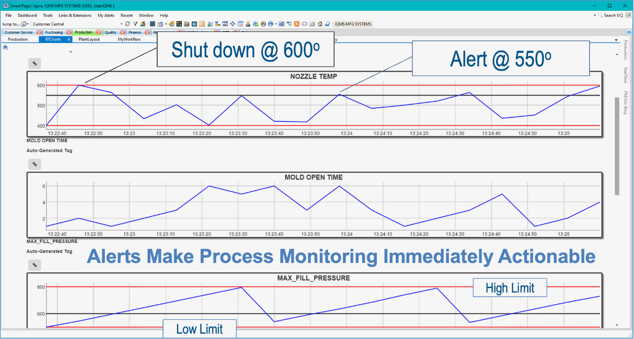 U praksi, tipičan scenario je da za ključne artikle ili alate (npr. kalupi za brizganje plastike, progresivne alatke za presovanje, ekstruderi)  inženjer kvaliteta u Inspection Setup‑u napravi RealTime Inspection grupu sa procesnim parametrima koje želi da prati, označi ih kao RealTime parametre i poveže sa konkretnim radnim centrom ili procesom. Tokom rada, RealTime Process Monitoring preuzima vrednosti sa senzora (ili integrisanih gage‑eva), upisuje ih u SPC i automatski označava parametre bojama: zeleno za unutar tolerancije, crveno za van specifikacije, plavo za izračunate vrednosti, uz mogućnost run-rules analize (trend, serija na jednoj strani srednje linije, nagle promene, itd.). Ovakav pristup omogućava fabričkim timovima da ne čekaju na krajnju dimenzionu kontrolu, već da vide kada proces “izlazi iz koloseka” i da intervenišu pre nego što dođe do škarta ili reklamacije.