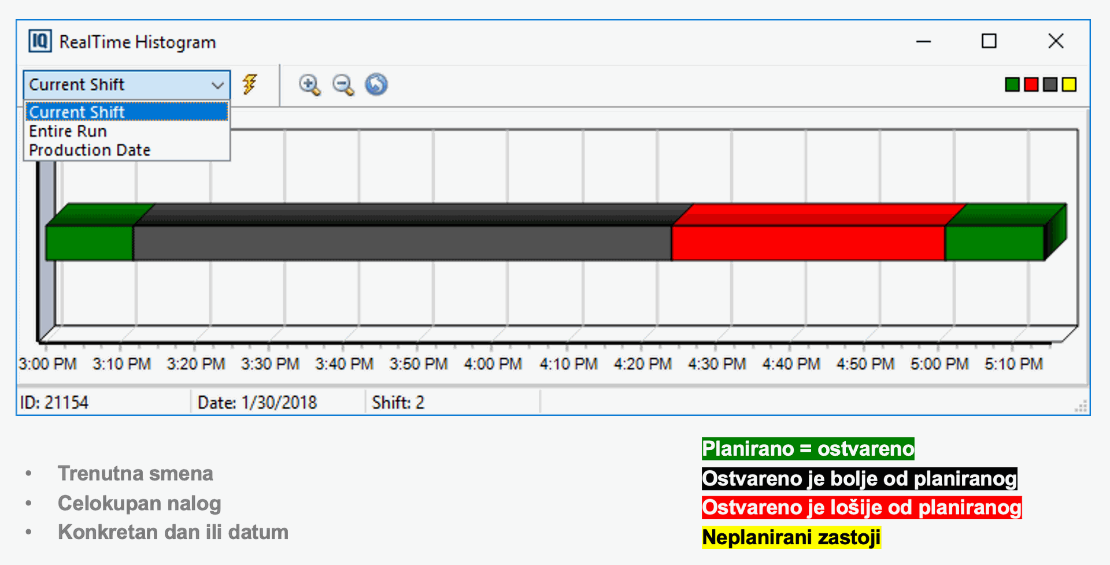 Svaki registrirovani ciklus u RealTime‑u predstavlja određeni broj gotovih komada, u zavisnosti od broja kaviteta ili multiplikatora definisanog na BOM‑u (proizvodna sastavnica ili tehnološka ruta), tako da se broj dobrih komada automatski preračunava iz broja ciklusa. Dodatni ulaz na MIU omogućava registraciju škarta po ciklusu, pri čemu RealTime odbija škartirane komade od ukupne proizvodnje i vodi zasebnu evidenciju za kasnije analize i razloge škarta. Pošto je sistem baziran na smenskom radu fabrika, RTServer automatski kreira smenske proizvodne izveštaje na osnovu prikupljenih ciklusa, dobrih delova, škarta i efektivnih sati rada mašina. Poslovođe tada mogu pre zaklučivanja finalnog smenskog izveštaja da prekontrolišu, koriguju i prijave realistične informacije.