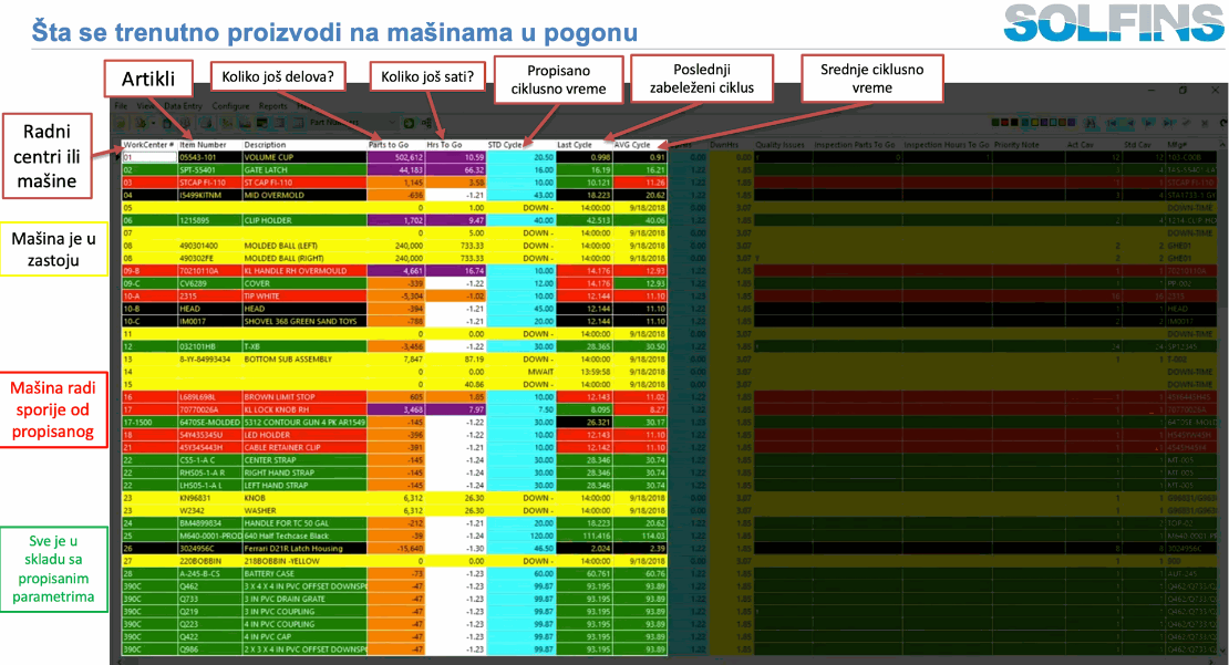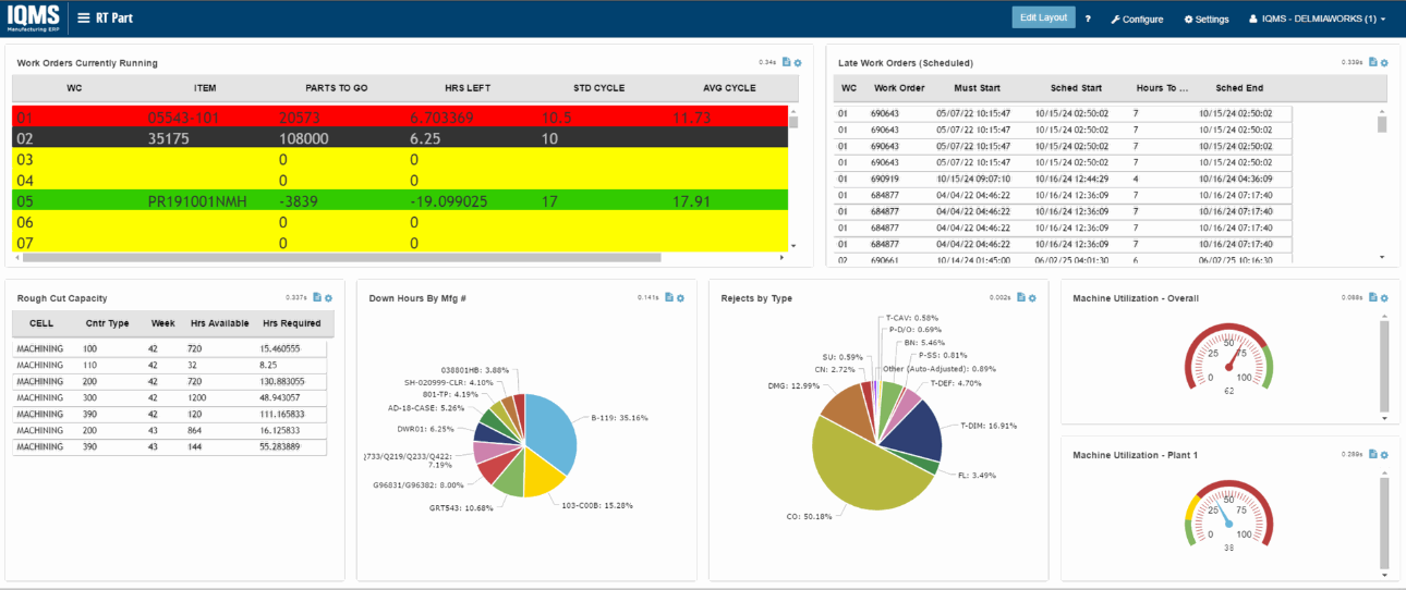 Kroz RealTime monitoring ekran u EnterpriseIQ/DELMIAWorks klijentu, korisnici u realnom vremenu vide koji radni nalozi su aktivni na kojim mašinama, trenutne cikluse, proizvodne sate i status (u radu, u zastoju, priprema, testiranje). Moguće je koristiti grafikon ciklusa kao alat za dijagnostiku nepravilnih signala i pogrešnog povezivanja MIU‑a, što je posebno korisno u fazi implementacije ili kod rešavanja problema u pogonu. RealTime je integrisan sa modulima za planiranje i radne naloge, pa se podaci o ciklusima i proizvodnji vezuju direktno na raspored (schedule) i radne naloge koji su zakazani na datim radnim centrima.Using-EnterpriseIQ.pdf+1​