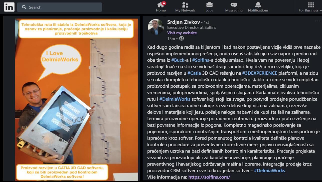 "Kad dugo godina radiš sa klijentom i kad nakon postavljene vizije vidiš prve naznake uspešno implementiranog rešenja, onda osetiš satisfakciju i sav napor i predan rad oba tima iz Buck-a i Solfins-a dobiju smisao. Hvala vam na poverenju i lepoj saradnji!