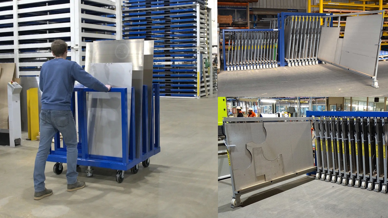 Ovi regali skladište lim vertikalno i imaju posvećene pregrade ili fioke za različite veličine materijala.