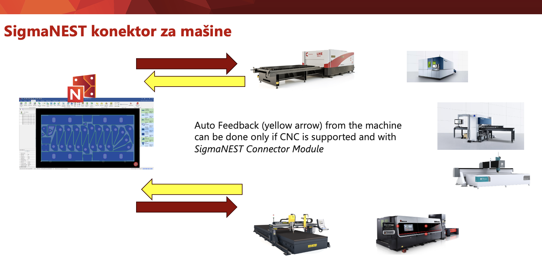 SigmaNEST Connector modul omogućava direktno slanje poslova na mašinu u definisanom redosledu zajedno sa CNC programima. Pored toga taj konektor zna kada je program učitan na mašinu, kada je započet rad, kada je nastao zastoj u sred posla i kada je program završen. Sve te statusne informacije se vraćaju automatski nazad u SigmaNEST aplikaciju ili bilo koji segment SigmaNEST softvera koji daje prikaze stausa svih poslova. Ovaj modul nudi totalnu automatizaciju i evidenciju bez ukljucivanja ljudi u proces evidencije.