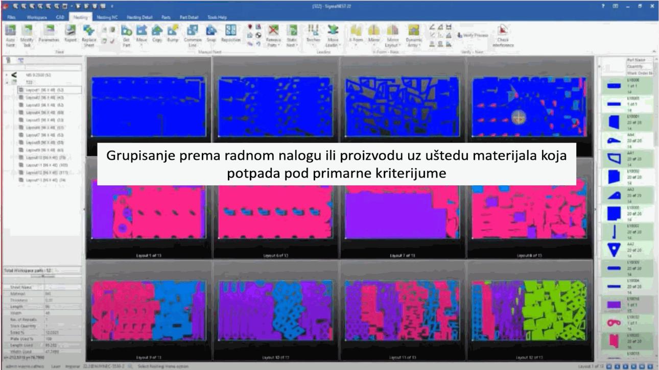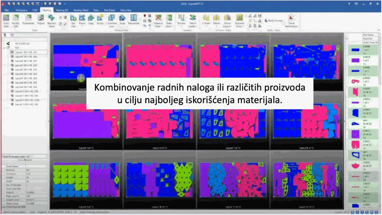 Znamo, sada će neki od vas reći da to nije moguće u vašoj firmi, zbog kasnijeg sortiranja, odvajanja delova, grupisanja spram proizvoda, zauzeća skladištenog prostora, narednih operacija ali baš te kriterijume možete zadati softveru kao uslov i da u isto vreme štedite materijal, ali da se ipak softver prilagodi vašim specifičnim zahtevima i da kombinujete više naloga odjednom. Dodatna pogonska aplikacija za operatere im daje vizuelnu informaciju o skidanju i razvrstavanju delova sa mašine (vidi sliku), što osigurava izbegavanje svih tipičnih grešaka i poteškoća.
