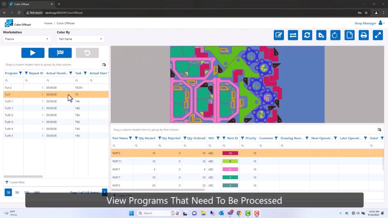 Operateri u pogonu mogu samostalno da unose progres i statuse za svaki radni nalog, krojnu listu ili zapravo program koji se izvršava, a koji ima vezu sa radnim nalozima. Ova aplikacija ne samo da omogućava laku evidenciju, već olakšava i sortiranje i razvrstavanje delova nakon izvršenog sečenja, jer omogućava operateru da mu pomoću boja prikaže delove koji treba da idu na savijanje, ili delove koji pripadaju istom proizvodu, ili istoj porudžbini kupca i slično. U zavisnosti od organizacije firme, operater tada kroz vizuelni prikaz može lako da razvrsta delova na prethodno pripremljene palete i da na taj način značajno