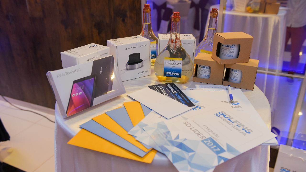 • Nagrade za pobednike - 3D štampač, softverske licence, plakete, 3D miševi, tablet, šolje, i specijalna rakija od kajsije sa Solfins tim bildinga u Junkovcu