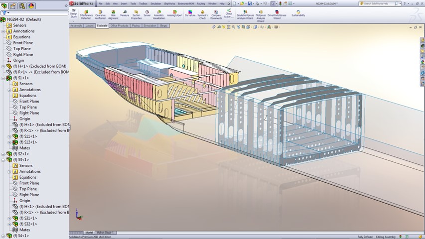 Ako pretpostavimo da su površinski modeli konstrukcije svih sekcija gotovi i da je još na samom početku osoba odgovorna za projekat  definisala strukturu sekcija i ostalih podsklopova u SolidWorks/Shipworks softveru.