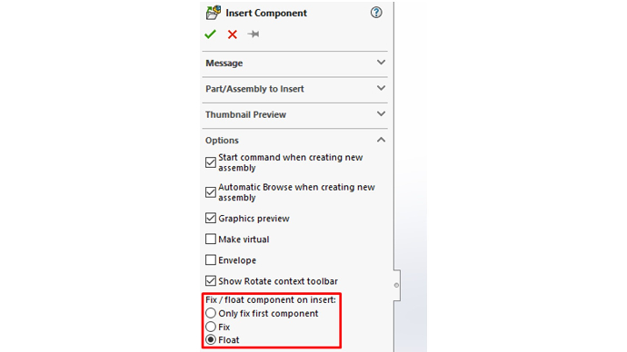 Opcije Fix on first component/Fix/Float prilikom ubacivanja komponenti u sklop.