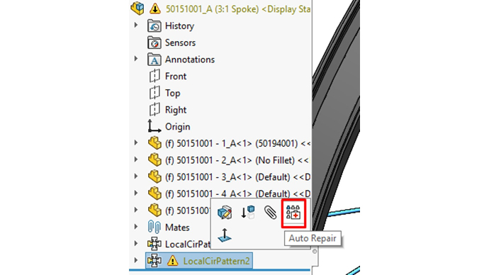 Komanda za automatsku popravku Linear i Circular Pattern-a na nivou sklopa.
