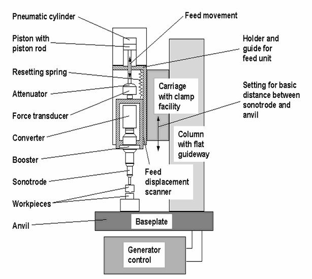 Oprema za ultrazvučno zavarivanje se najčešće sastoji od prese čiji su glavni delovi:
