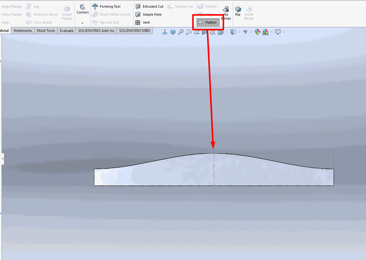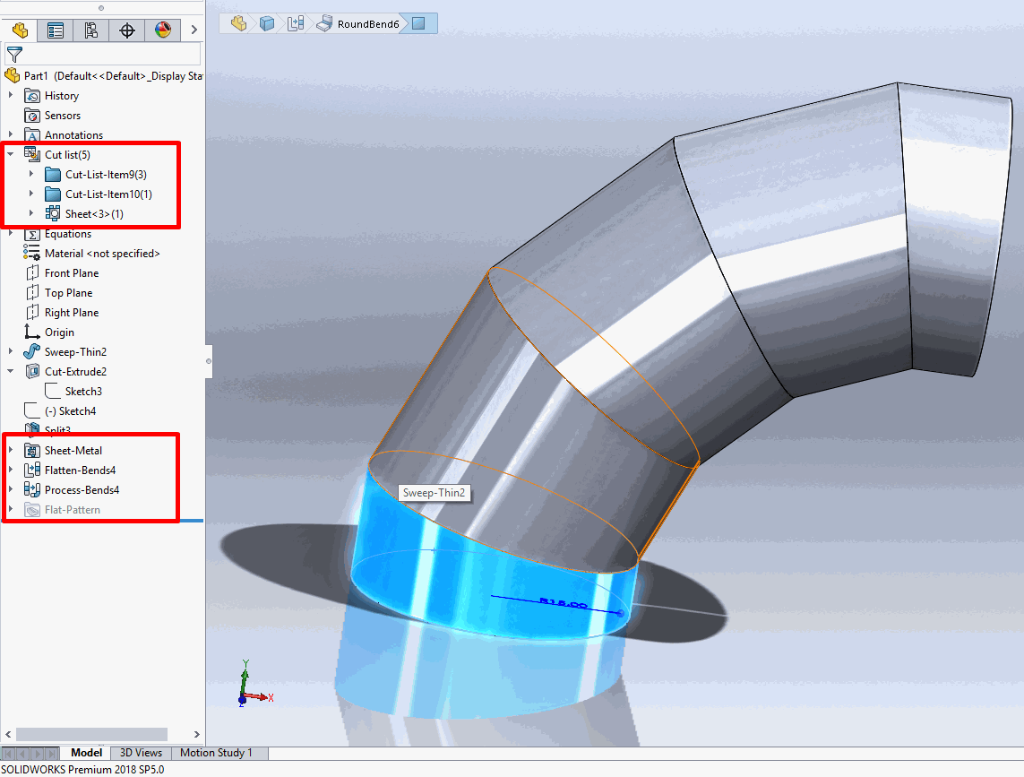 Na Sheet metal kartici iskoristiti alat Insert bends. Nakon što se iskoristi ovaj alat, umesto 5 različitih tela dobija se Cut lista i model postaje Sheet metal deo, pa je samim tim moguće dobiti razvijeno stanje.
