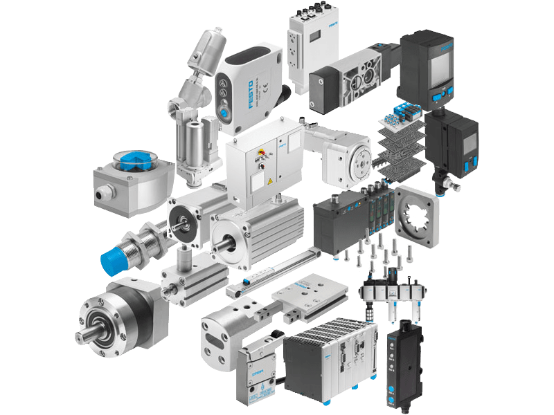 Pneumatski pogoni, Servopneumatski sistemi pozicioniranja, Elektromehanički pogoni, Motori i kontroleri, Hvataljke, Sistemi rukovanja, Vakuumska tehnika, Ventili, Ventilski blokovi, Motion Terminal, Senzori, Sistemi za obradu slike, Priprema vazduha pod pritiskom, Sistem pneumatskih priključaka, Električna tehnika spajanja, Tehnika upravljanja i softver, Softver, Druge pneumatske komponente, Procesna automatika, Sistemi "ključ u ruke", Sistemi sa specifičnim funkcijama...