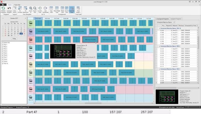 - Ima funkcijo "real-time load balancing", ki učinkovito razporeja delo med stroji in sekundarnimi operacijami. Pomembno je omeniti, da se stroji s podobnimi tehnološkimi možnostmi razvrstijo v skupine in da SigmaNEST v ozadju ustvarja CNC programe za vse stroje iz skupine, zato če sistem za načrtovanje – Load Manager razporedi program (krojno listo) na drug stroj, programska oprema samodejno posreduje stroju ustrezen program brez človeške intervencije.